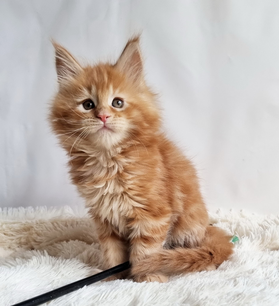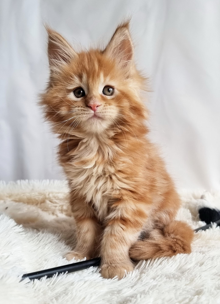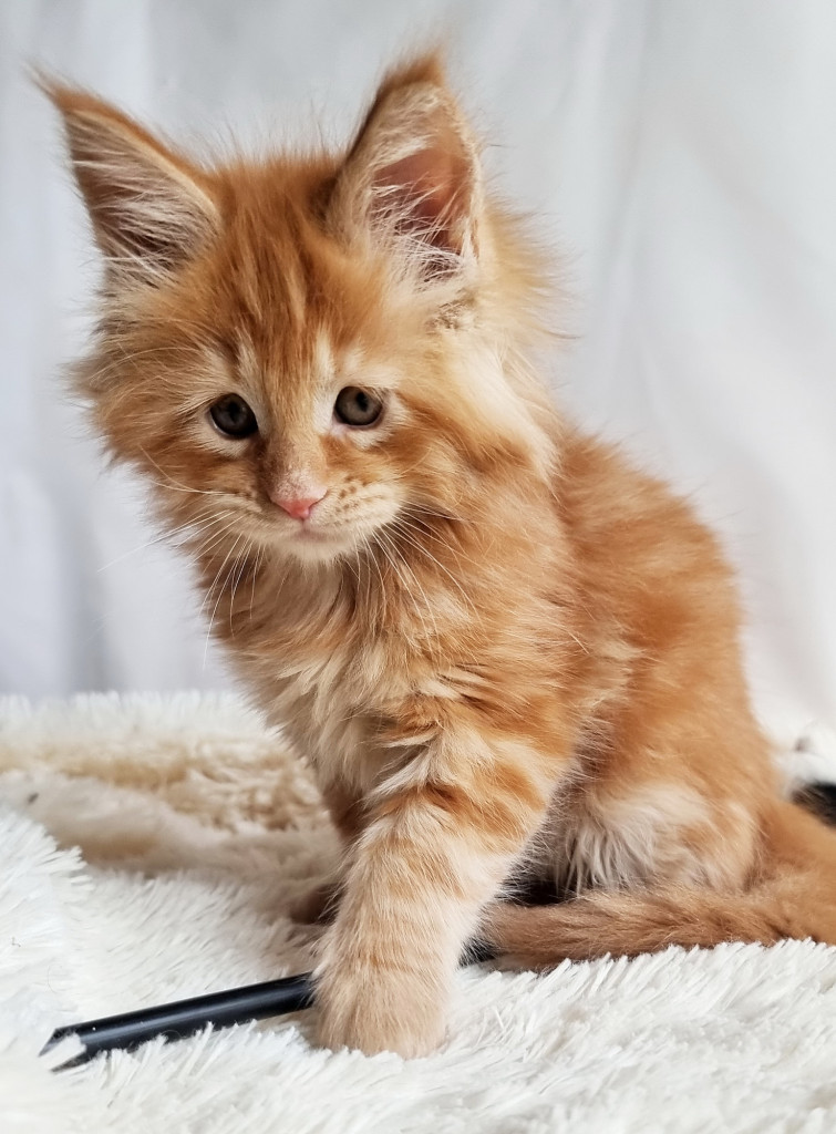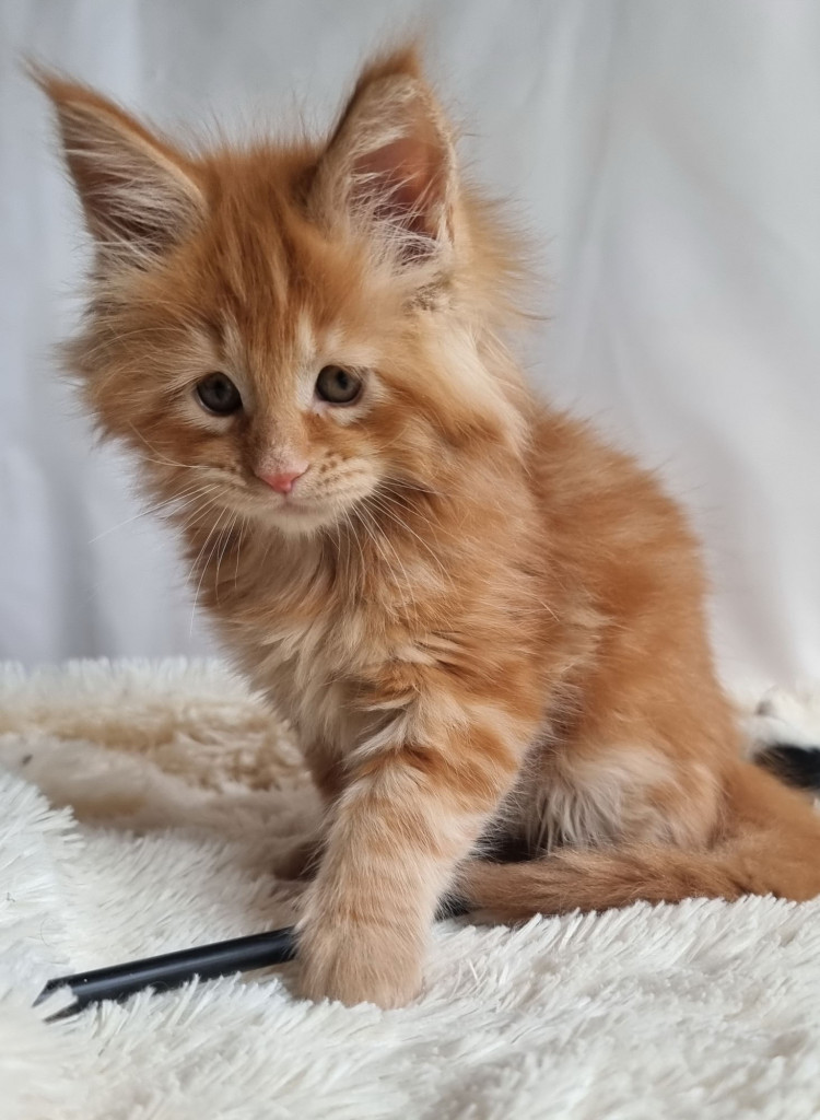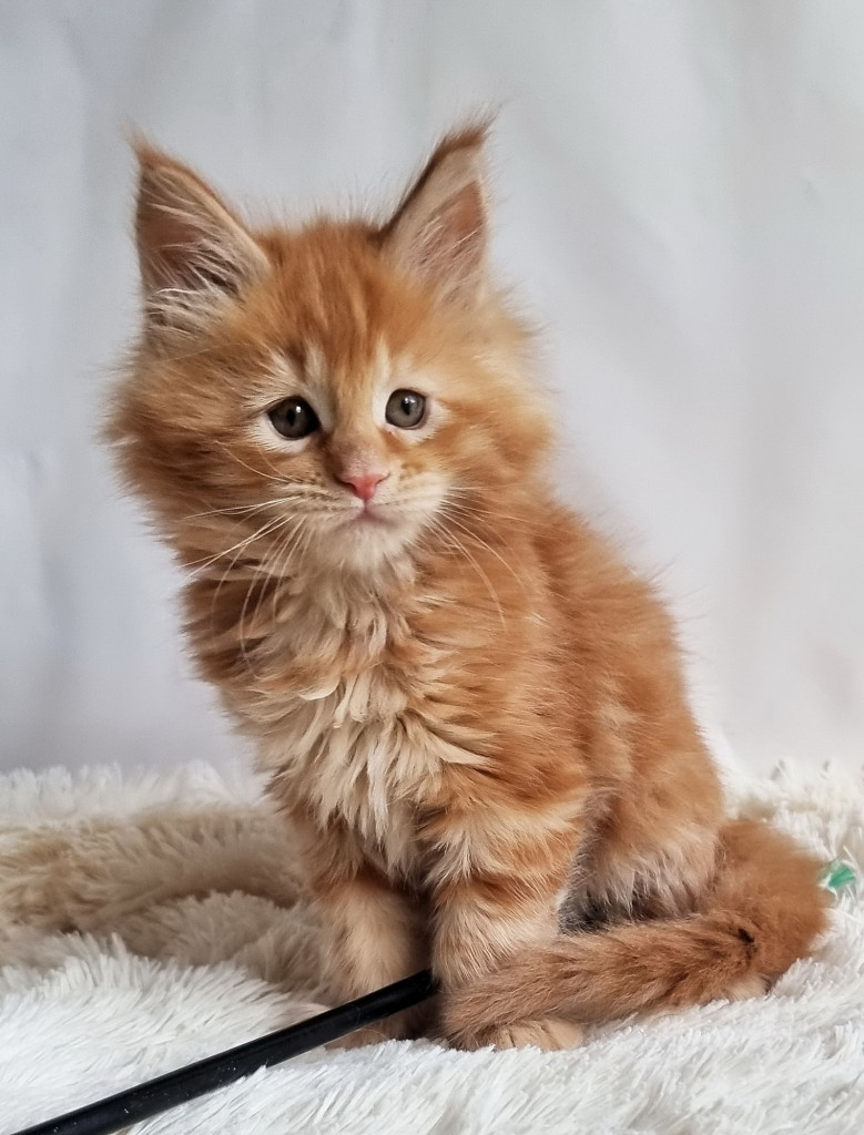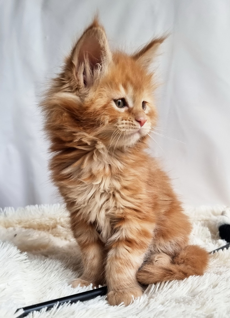 Котенок имеет крупные, высокие уши с кисточками, придающие ей особую изящность и характерную породу особенность. Ее статная осанка и мощное тело сочетаются с мягкостью и игривым характером. Это умная, ласковая и любознательная девочка, которая просто обожает внимание и общение с людьми.