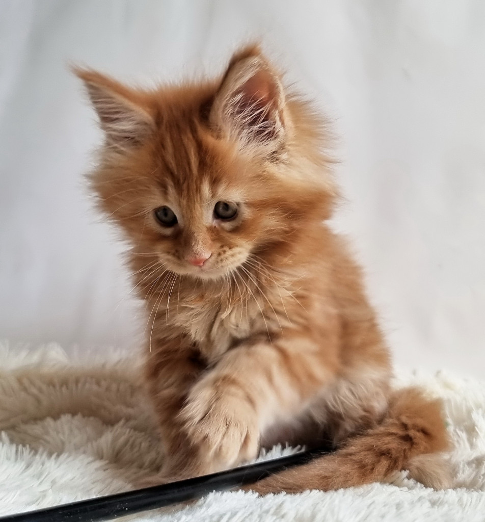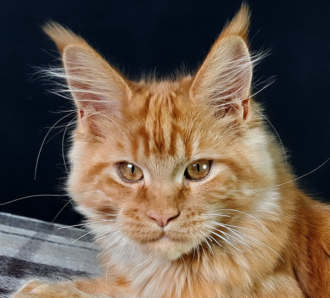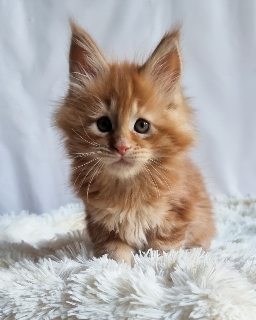 Это прелестная девочка-мейн-кун, настоящее воплощение грации и красоты. У нее густая, шелковистая шерсть, выразительные глаза которые словно смотрят с любопытством и нежностью.